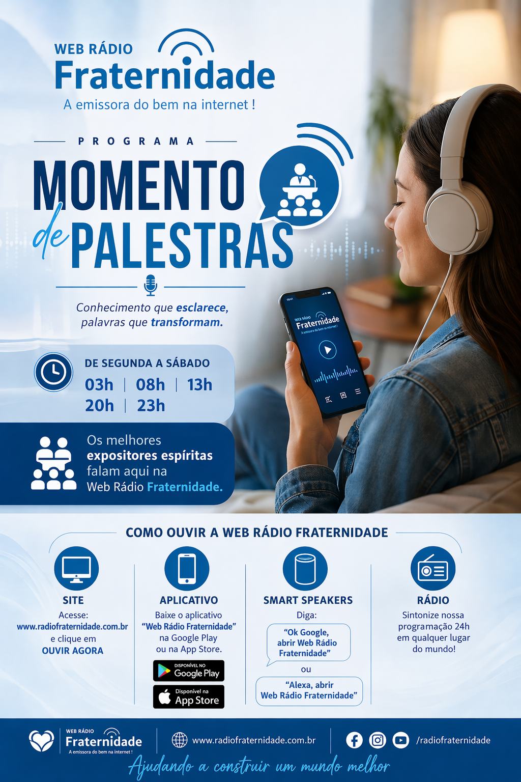 MOMENTO DE PALESTRA - SEMANA 15/52 (13 à 18/04/2026) - Acompanhe pela www.WebRadioFraternidade.com.br, no MOMENTO DE PALESTRA desta semana, as reprises com os expositores: Honório Onofre de Abreu (MG), Eulália Bueno (SP), Suely Caldas Schubert (MG), Haroldo Dias (MG) e Divaldo Franco (BA). As reprises, do MOMENTO DE PALESTRA, são rotativas entre 05 horários diariamente, durante a semana, ou seja, de 2ª feira a sábado, sempre tem uma reprise diferente, no MOMENTO DE PALESTRA, às 03h10, 08h10, 13h10, 20h10 e 23h10 (horário de Brasília), conforme abaixo: