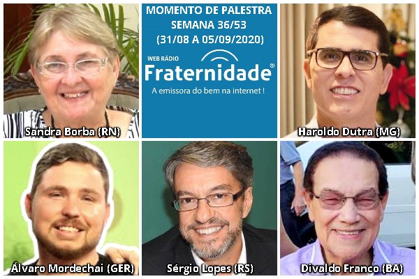 MOMENTO DE PALESTRA - SEMANA 36/53 (31/08 à 05/09/2020) - Acompanhe pela www.RadioFraternidade.com.br, no MOMENTO DE PALESTRA desta semana, as reprises com os expositores: Sandra Borba (RN), Haroldo Dutra Dias (MG), Álvaro Mordechai, Sérgio Lopes (RS), Divaldo Franco (BA) .