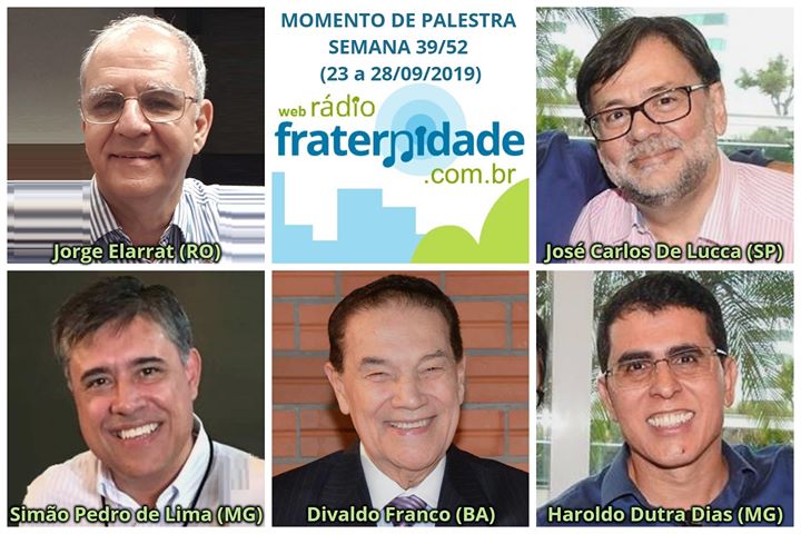 Acompanhe pela www.RadioFraternidade.com.br, no MOMENTO DE PALESTRA desta semana, as reprises das palestras com os expositores: Jorge Elarrat (RO), José Carlos De Lucca (MG), Simão Pedro de Lima (MG), Divaldo Franco (BA) e Haroldo Dutra Dias (MG).