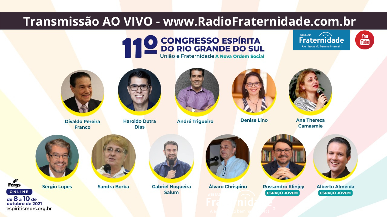 Os tempos são chegados. E junto com os ventos que sopram anunciando a regeneração da humanidade, chega o convite para que façamos parte da construção desta nova era, com união e fraternidade entre todos. Com o objetivo de sensibilizar e estimular esta união e a fraternidade a fim de que exerçamos a influência amorosa e moralizadora do Espiritismo sobre a sociedade em que estamos inseridos, a Federação Espírita do RS (Fergs), no ano do seu centenário, realiza o XI Congresso Espírita do Rio Grande do Sul, com o tema União e Fraternidade: A Nova Ordem Social. O congresso ocorrerá nos dias 8, 9 e 10 de outubro, de forma totalmente online, inclusiva e gratuita (tendo modalidades de contribuições espontâneas). O evento é destinado a trabalhadores e estudantes espíritas de todas as localidades, simpatizantes, curiosos e adeptos de outras religiões, bebês, crianças, jovens e adultos.